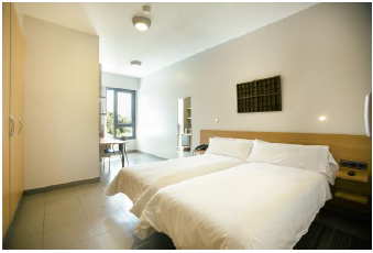 La résidence dispose de chambres pour 6 personnes. Les garçons et les filles sont séparés dans des appartements differents, où dans chaque étage, il y a une salle de bain (30 baignoires, 12 douches séparées, 12 toilettes). Les groupes sont formés par âges.